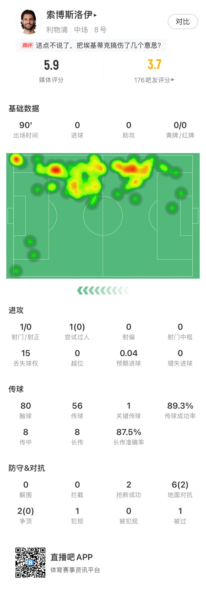 Trong trò chơi này, Sobosloy đã bắn mà không có mục tiêu và không vượt qua 1 lần mà không thành công. Anh ấy đã vượt qua 56 lần và vượt qua 1 lần vượt qua. Tỷ lệ thành công vượt qua là 89,3%. Anh ta phải đối mặt với mặt đất hai lần và chiến đấu cho top hai lần mà không thành công.