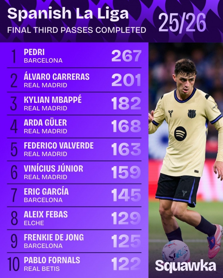 Xếp hạng các đường chuyền ở khu vực thứ ba của La Liga: Pedri được xếp hạng đầu tiên với 267 lần, 5 người chơi Real Madrid đã lọt vào top 10